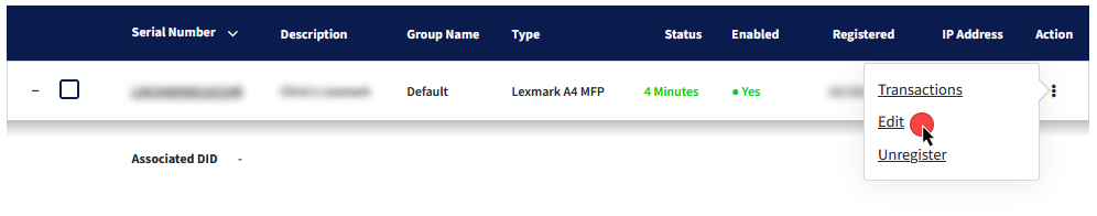 Click on the device you would like to edit by clicking its Serial Number or by clicking the vertical ellipses (⋮) in the Action column and then selecting Edit: