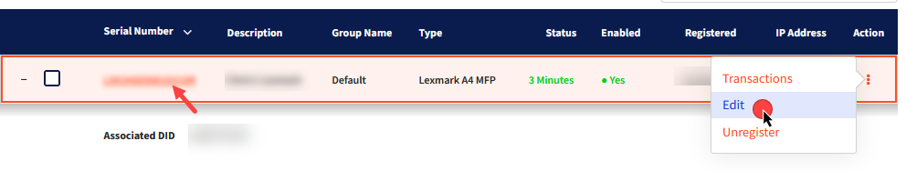 Click on the device you would like to edit by clicking its Serial Number or by clicking the vertical ellipses (⋮) in the Action column and then selecting Edit: