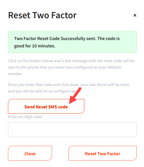 If you accidentally click out of the Reset Two-Factor window, click the Reset Two-Factor button on the page. It will prompt the window to pop out once more asking for the six-digit code.