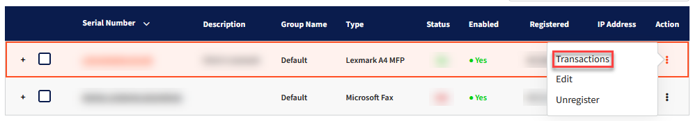 Select your device by clicking the vertical ellipses (⋮) in the Action column and then selecting Transactions.