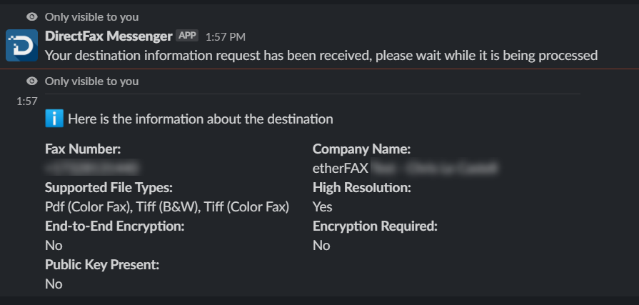 In the message field, type /fax_destination_info followed by the etherFAX destination that you would like to investigate. you wish to see details on: