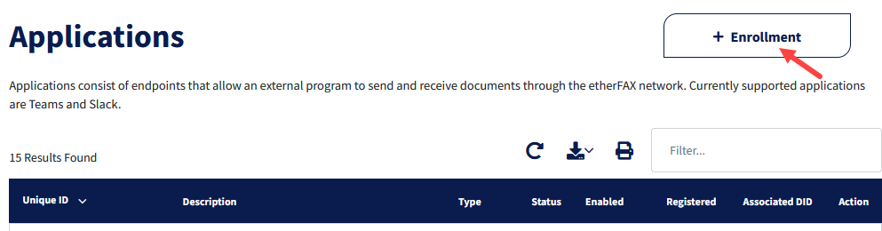 On the left-hand side, choose Endpoints > Applications. In the upper-right corner, click the + Enrollment button: