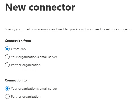 For Connection from select Office 365 and then select the Connection to option to Your organization’s email server and then click Next: