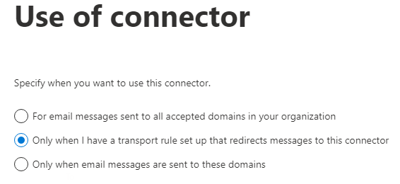 On the Use of connector page, select the middle option of Only when I have a transport rule set up that redirects messages to this connector and then click Next: