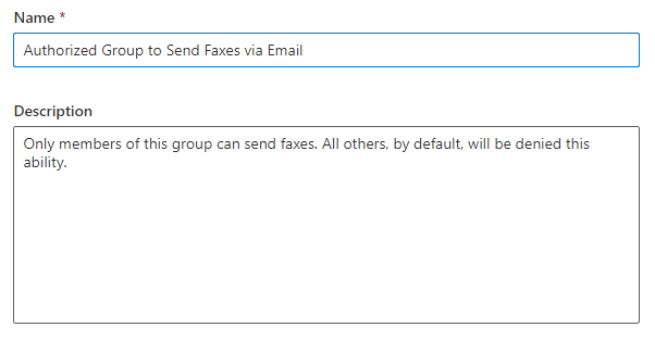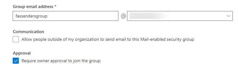 It is recommended to use something easy to remember such as faxsendersgroup @ [your organization’s domain] (where your organization’s domain should be prepopulated).