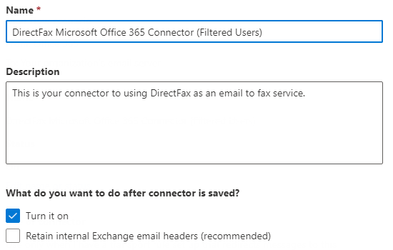 Give your Connector a name and description (this is optional but recommended). After doing so, leave the Turn it on checkbox on, while toggling off the Retain internal Exchange email headers (recommended) checkbox and then click Next:
