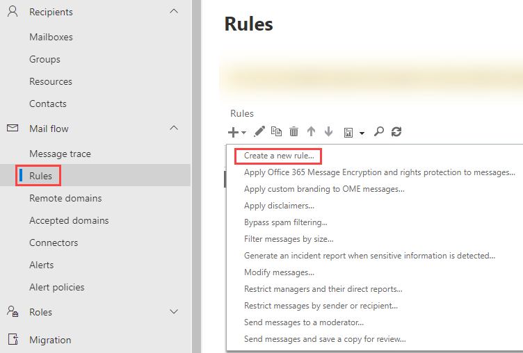 Visit Rules under Mail flow, then click + Rule followed by Create a new rule…