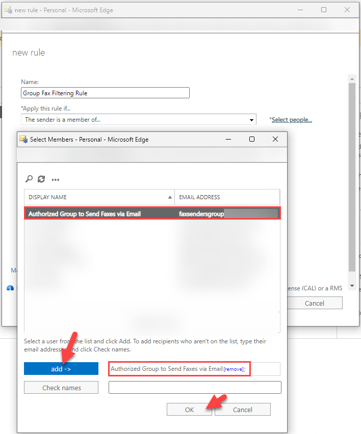 Under Apply this rule if… select the sender is a member of…. A pop-up titled Select Members will appear where you will choose your recently created group. Once chosen, click add → and then OK: