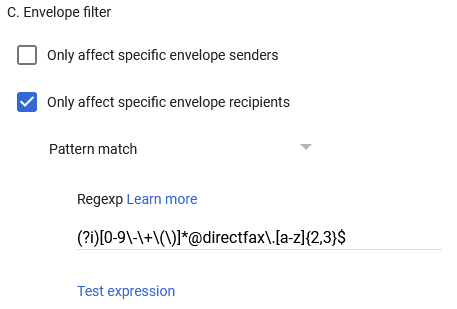 Below, within Envelope filter select the checkbox to Only affect specific envelope recipients. Select the drop-down and change it from Single email address to Pattern match.